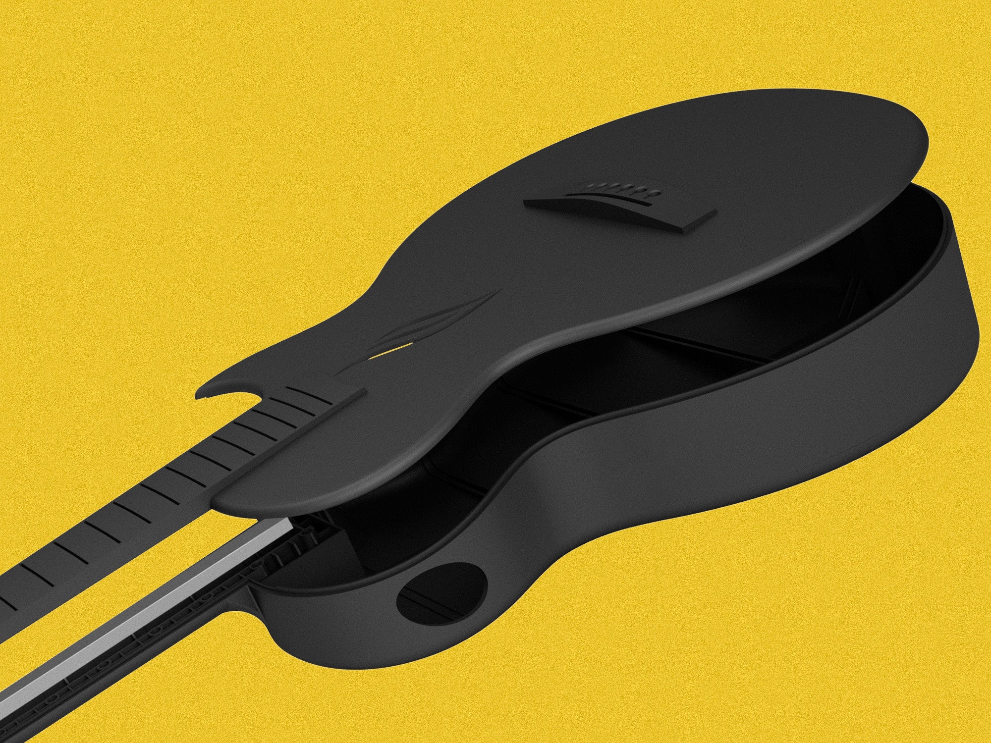 The body of this Nova Go guitar is half-sized, molded all in one piece, meaning that the bridge is a cohesive part of the top, not glued upon like traditional acoustic guitars. It would never pop off. We've also put a truss rod into the neck, giving more adjustability for the string action.